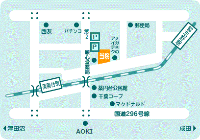 【電車でご来院の方】 薬園台駅1階エレベーターすぐ左の東口から、線路沿いの道を直進。 【車でご来院の方】 薬円台眼科駐車場(6台)。 国道296号線薬円台一丁目交差点より北へ曲がり、京成線踏み切りを渡って、直進右側にあります。 第二駐車場(5台)さらに20m先にあります。